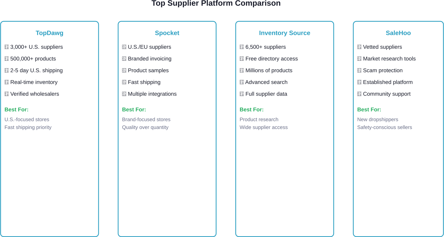 For U.S.-focused stores prioritizing fast shipping, TopDawg's verified supplier network provides access to domestic wholesalers with 2-5 day delivery times. The platform's 3,000+ suppliers and 500,000+ products cover most major categories.