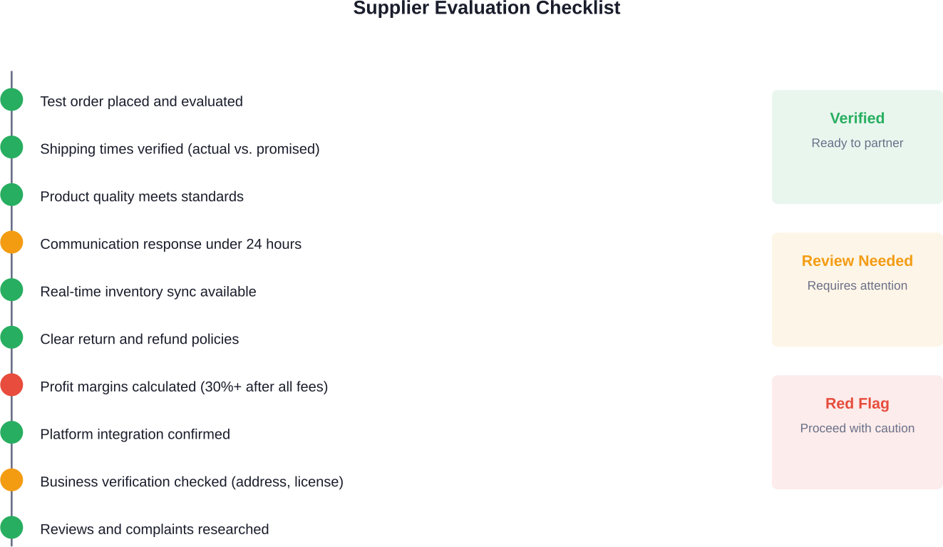 Test everything. Place sample orders, measure actual shipping times, evaluate product quality, and assess communication responsiveness before listing products. The time invested in supplier evaluation prevents customer service nightmares and refund requests later.