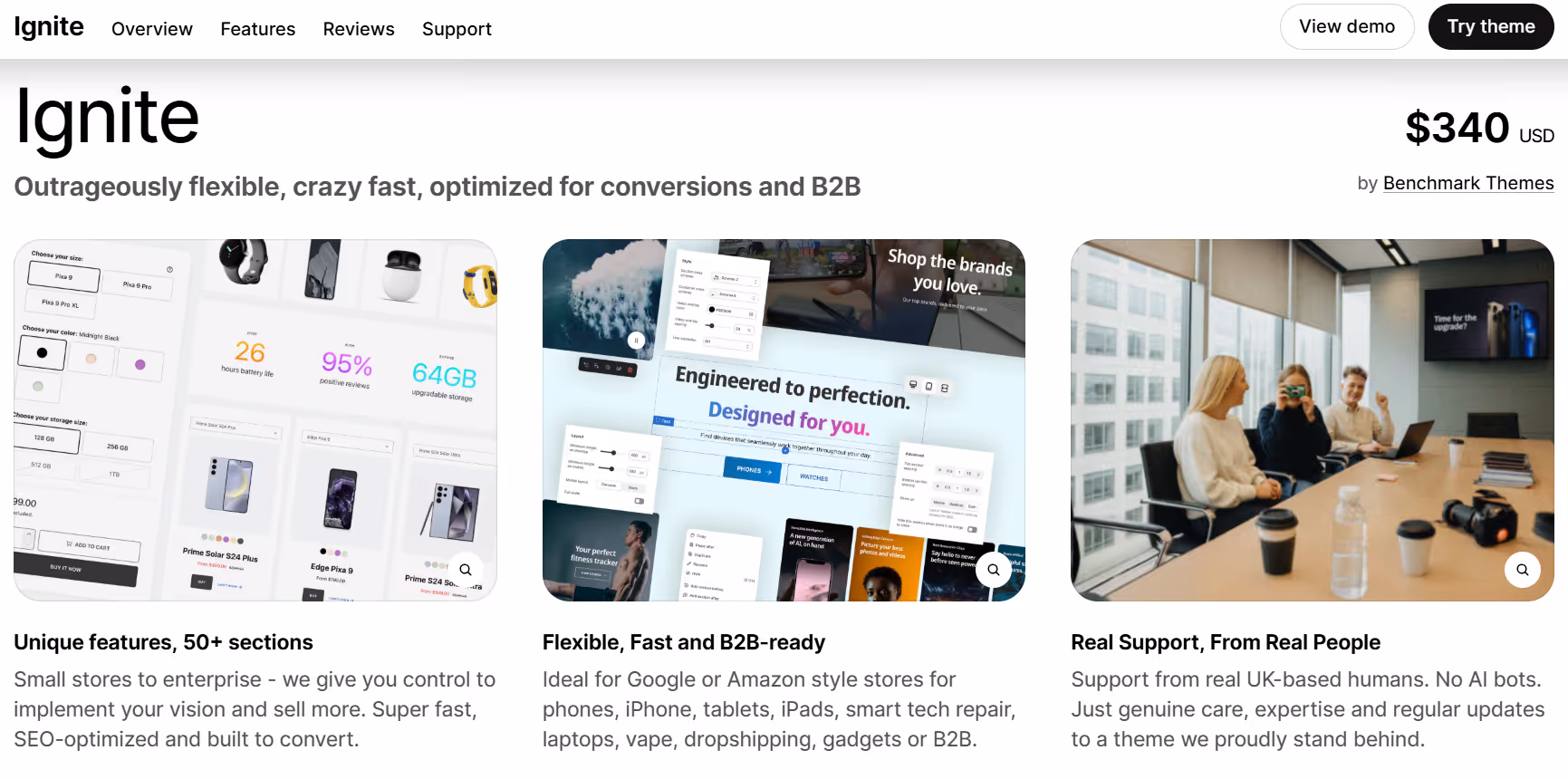 The theme also includes tools to showcase featured products and promotions. Sections for banners, flexible content blocks, and highlighted collections give stores the ability to structure important information effectively. Ignite is optimized for desktop and mobile devices, ensuring smooth navigation and readability across different platforms. Integration with Shopify makes it possible to expand functionality without complicating the store setup.
