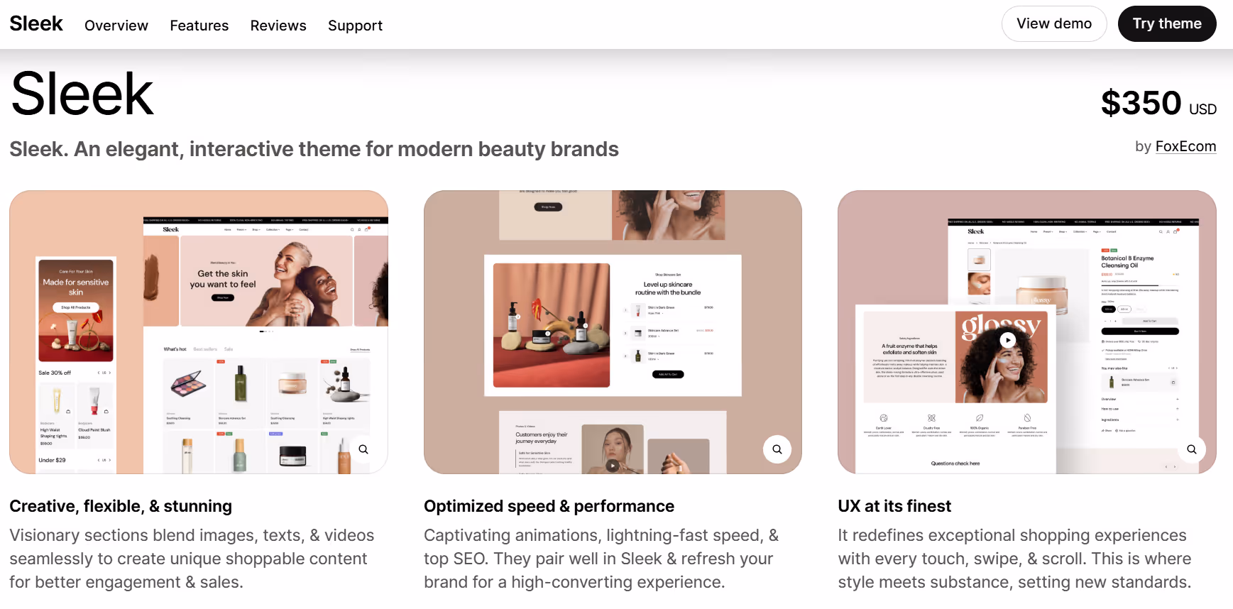 Sleek provides a minimalist layout that emphasizes product visibility and simple navigation. The theme includes customizable sections for homepages, product pages, and collections, allowing merchants to organize images, text, and featured items without touching code. The focus on clean lines and clear structure makes it easier for visitors to browse products, understand information quickly, and explore different sections of the store.
