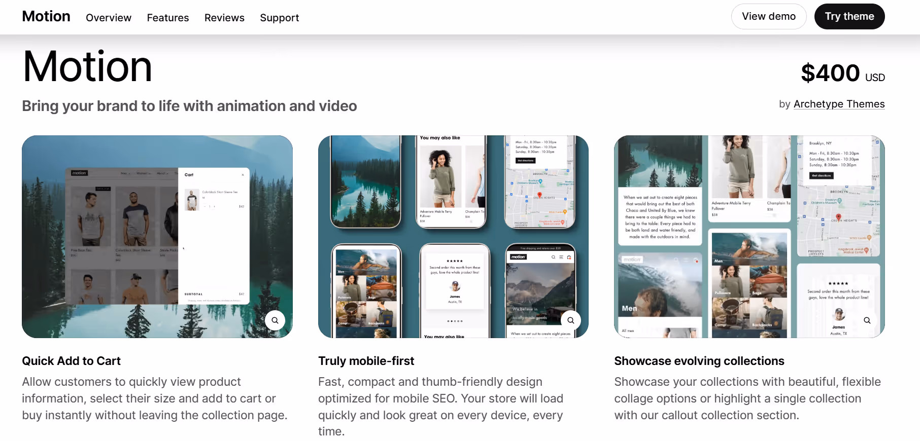 Motion is designed to create a dynamic and interactive shopping experience on Shopify stores. It focuses on smooth animations and transitions that help guide visitors through products and pages without being overwhelming. The theme provides flexible layout options for homepages, product pages, and collection pages, making it easier to highlight key products and promotions. Users can adjust sections and content blocks without touching code, allowing for experimentation with different layouts and visual storytelling approaches.