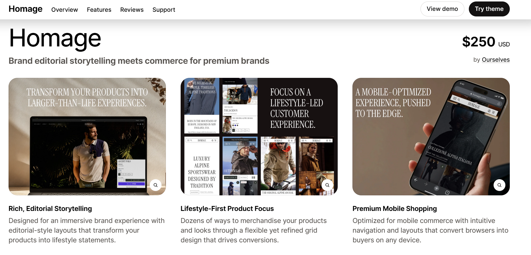 Homage combines editorial-style layouts with commerce-friendly design, allowing clothing stores to organize products in ways that feel like part of a story rather than a simple grid. Stores can use refined grid designs and flexible merchandising options to rotate looks, highlight seasonal drops, or show full outfits together. The theme also handles images and navigation smoothly, so shoppers can browse multiple collections without feeling lost.