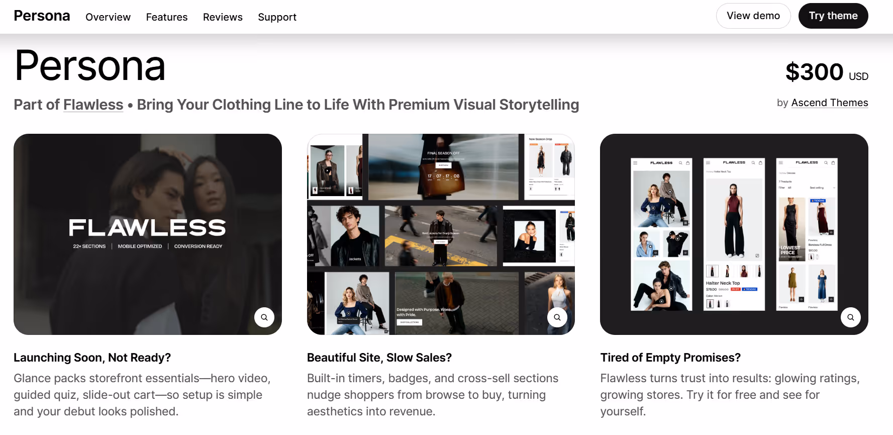 Persona is one of the preset designs offered with the Flawless Shopify theme. Stores that choose this design often work with a mix of visual sections and flexible layouts so they can place product images, banners, and promotional text where it feels natural, rather than cluttered. It gives online shops a way to break up long product lists with curated content blocks, letting visitors take in pieces of the collection one at a time while keeping the overall site structure familiar and straightforward. People working with Persona usually find that the balance of visuals and product details helps guide browsing without overwhelming customers.