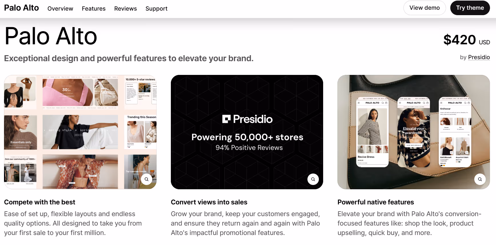 Palo Alto is a theme that gives clothing stores a range of layout options and built‑in features aimed at making browsing and shopping feel more complete. Shops using it can arrange large images, galleries, and video alongside product details to help people see items from different angles and in context. The preset layouts such as Palo Alto, Dynamo, Phenomena, and others give teams starting points that look quite different, which means stores with varied styles can pick what fits their inventory and visual approach. The way the theme handles navigation and product discovery also helps visitors move from category to category without getting stuck in long, unfiltered lists.