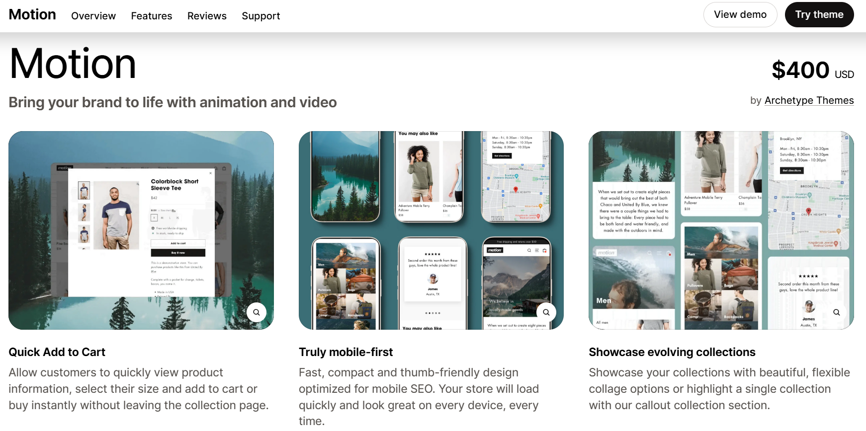 Motion is a Shopify theme that focuses on bringing movement and interaction into online stores. Shops using Motion often work with animations, smooth scrolling effects, and video content so product pages and collection views feel a bit more dynamic. Instead of a static layout, visitors see subtle motion as they scroll and browse, which can help present clothing items in context and show texture or fit in a more engaging way. The theme also includes multiple preset designs that give stores different visual approaches while keeping the core layout and feature set consistent.