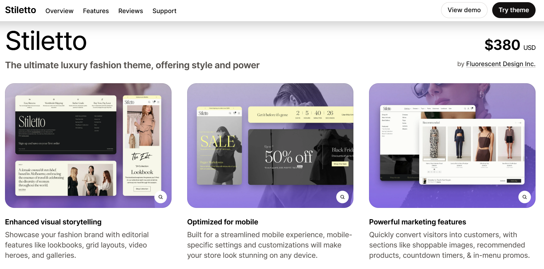 Stiletto is a preset within a Shopify theme that gives clothing stores a balanced layout between product grids and editorial content. Shops using Stiletto often mix large visuals with neat product sections so visitors can get a feel for the style and context of the pieces on offer. Instead of every product sitting in the same kind of box, there are places where images and text can sit side by side, or where a featured look leads naturally into a collection below. This gives a little more space for telling a story about garments without making the page feel too busy or cluttered.
