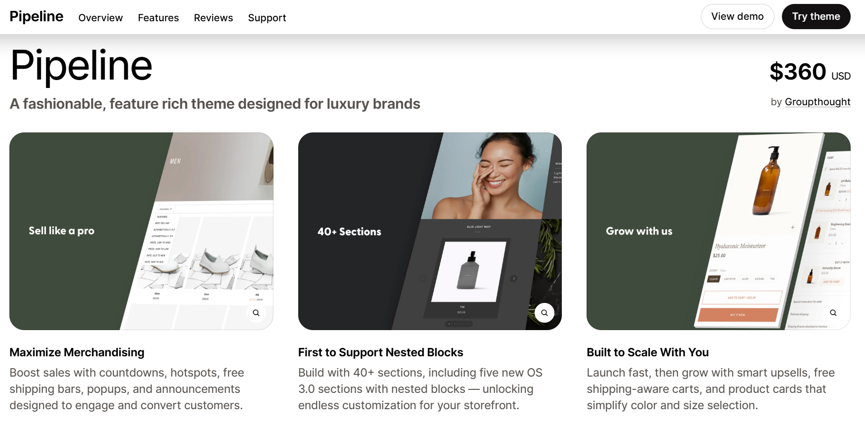 Pipeline is a Shopify theme preset that clothing stores often pick when they want a clean, focused layout that handles long product lists without feeling too crowded. Shops working with Pipeline usually set up sections where products sit in tidy rows and columns, and there’s room above and below those grids for banners or intro images. It feels like a straightforward way to get clothes in front of visitors without a bunch of distracting extras, so people can scroll and see offerings at their own pace. The structure also makes it easier to separate different groups of products, like new arrivals or seasonal lines, without having to force everything into the same box.