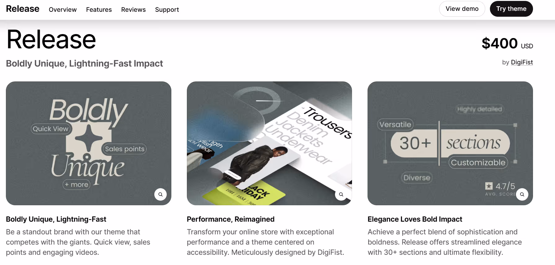 Release is a Shopify theme preset that clothing stores often choose when they want to blend product displays with lifestyle visuals in a balanced way. Stores using Release tend to put larger images or banners at the top of the page to set a mood or highlight a collection before showing grids of products. Once someone scrolls into the product area, things stay orderly and easy to navigate, with products presented in rows that make sense for browsing. The shift between big visuals and product lists gives a sense of context without feeling like a slide show shoved in front of items.