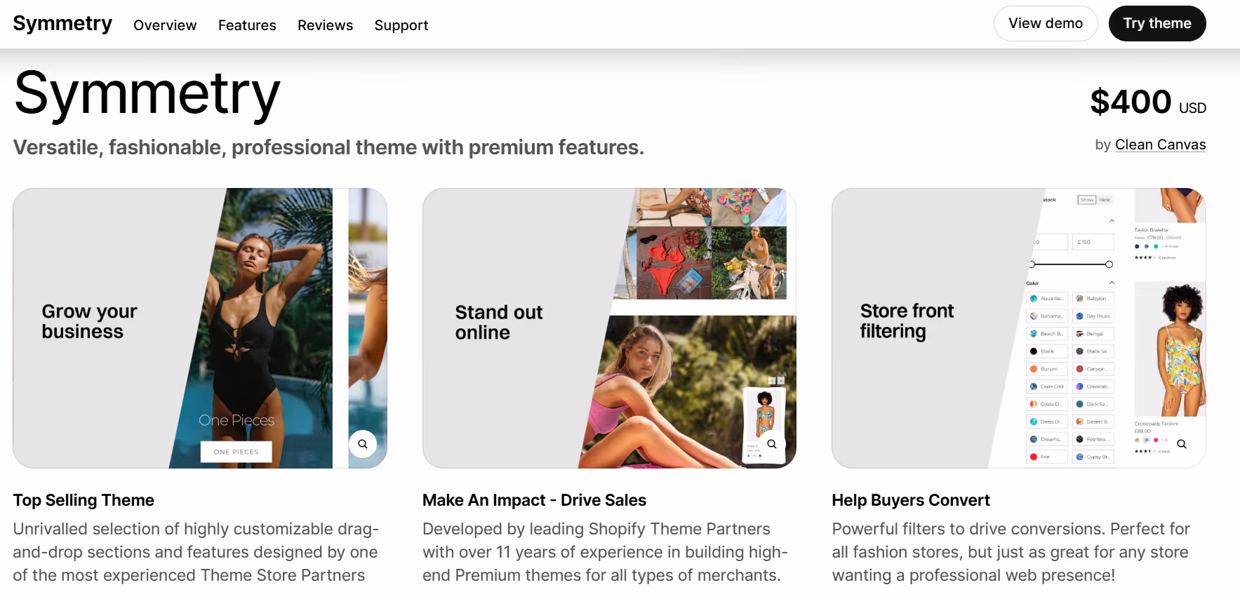 Symmetry is a Shopify theme preset that clothing stores use when they want a structured, grid‑based layout that still feels open and organized. Stores working with Symmetry usually break up long lists of products into neat rows and columns, and there’s room above those grids for banners or featured images that help introduce a collection. The theme doesn’t try to dazzle with too many effects; instead it gives shops a way to lay things out so that people can scroll through categories without feeling overwhelmed. That balance between visual sections and tidy product blocks makes it easier to manage a range of items without losing clarity.