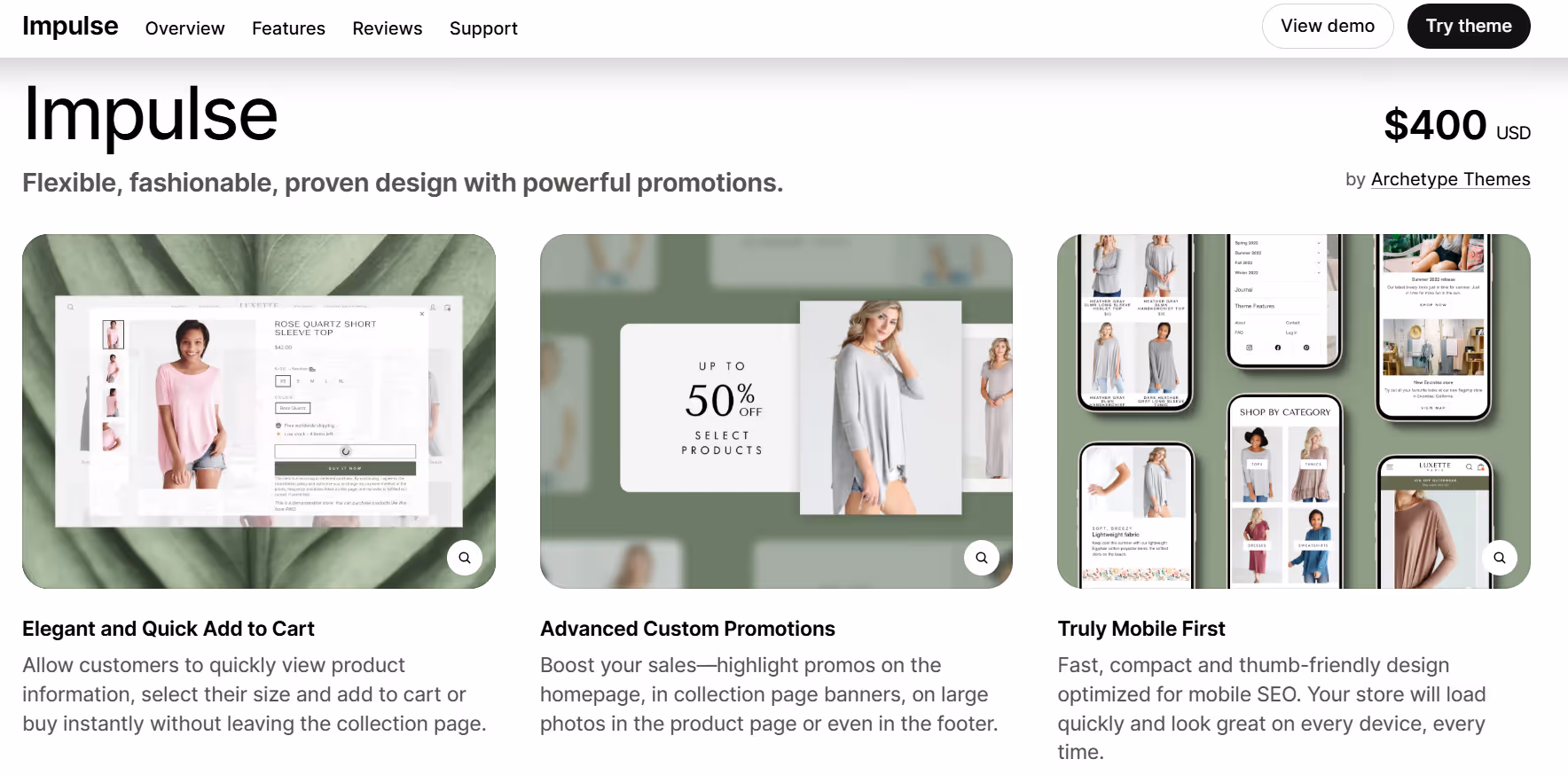 Stores using Impulse often work with layouts that mix bold visuals and curated product sections in ways that don’t feel random. Clothing sellers can put larger images or banners near the top to set a tone or focus on a new collection, then follow that up with tighter grids of items below. The way Impulse handles spacing and alignment means stores can show off outfits and featured looks without the page feeling jammed. It’s a setup that makes sense for shops where a visual first impression matters but the products still need to be easy to scan.