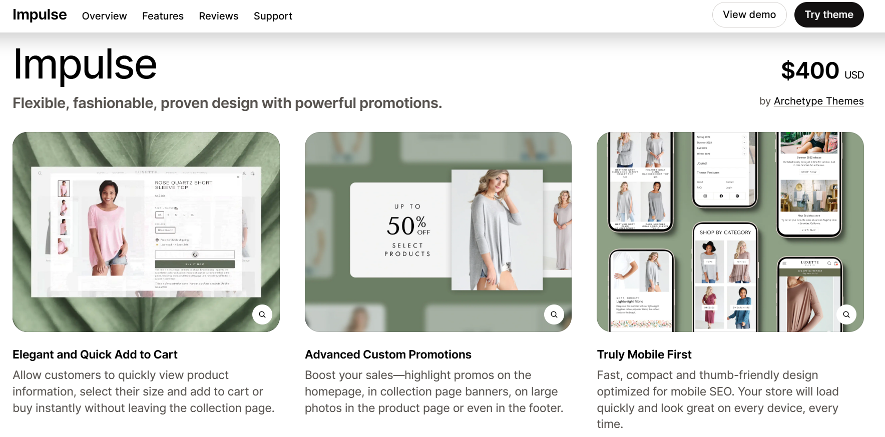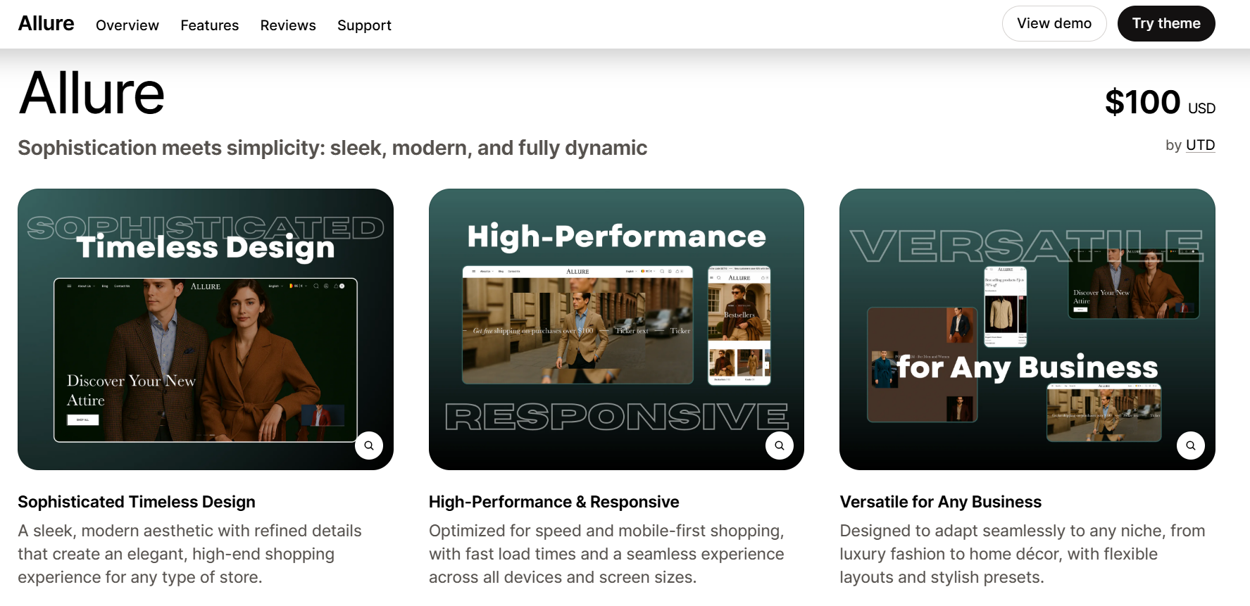 Allure is a Shopify theme preset built to highlight clothing collections with a clean and stylish design. It focuses on giving each product room to stand out while keeping the overall look organized and easy to navigate. Sections for featured products, promotions, and seasonal collections are flexible, letting stores experiment with layout and presentation without feeling cluttered.
