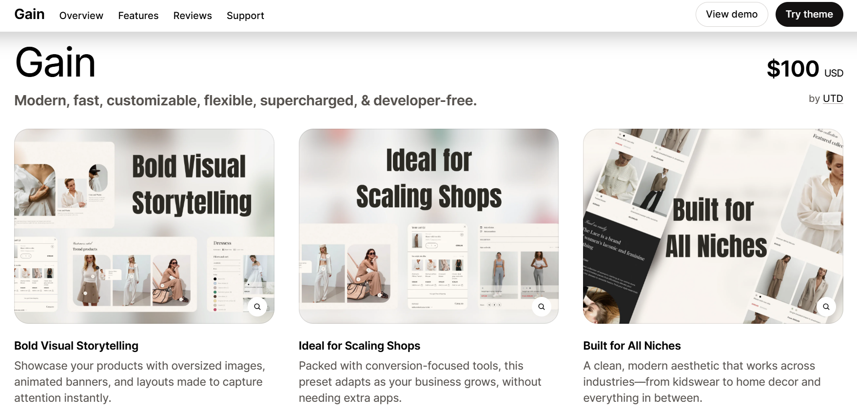 Gain is a Shopify theme preset that clothing stores use when they want a clean but flexible layout that handles both product lists and visuals without feeling too plain. Stores working with Gain often put a mix of images, featured collections, and banners together so that the page doesn’t look like a wall of clothes. The flow usually moves from larger visuals into groups of products, which helps visitors ease into browsing without feeling overwhelmed by too many items at once. It also gives space for stores to highlight specific looks or styles before showing all products.