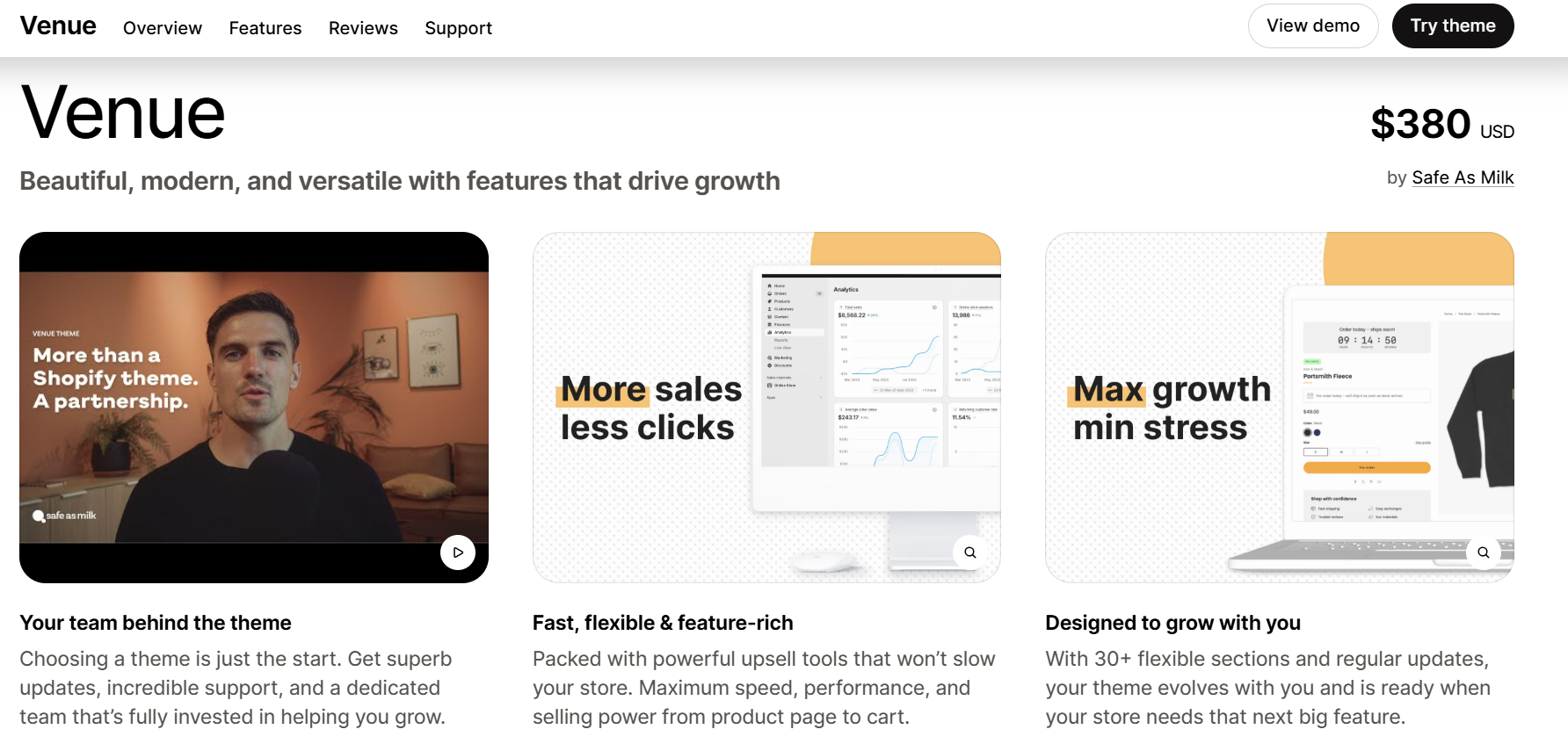 The theme supports interactive features like quick view, filtering, and sticky navigation to make shopping smoother. Stores often use these tools to help visitors find products faster and reduce friction during checkout. Venue also adapts well to different image types, letting stores mix product shots with lifestyle visuals for a more engaging presentation. Overall, the theme provides a clean, versatile framework that works well for stores with diverse clothing lines and promotions.