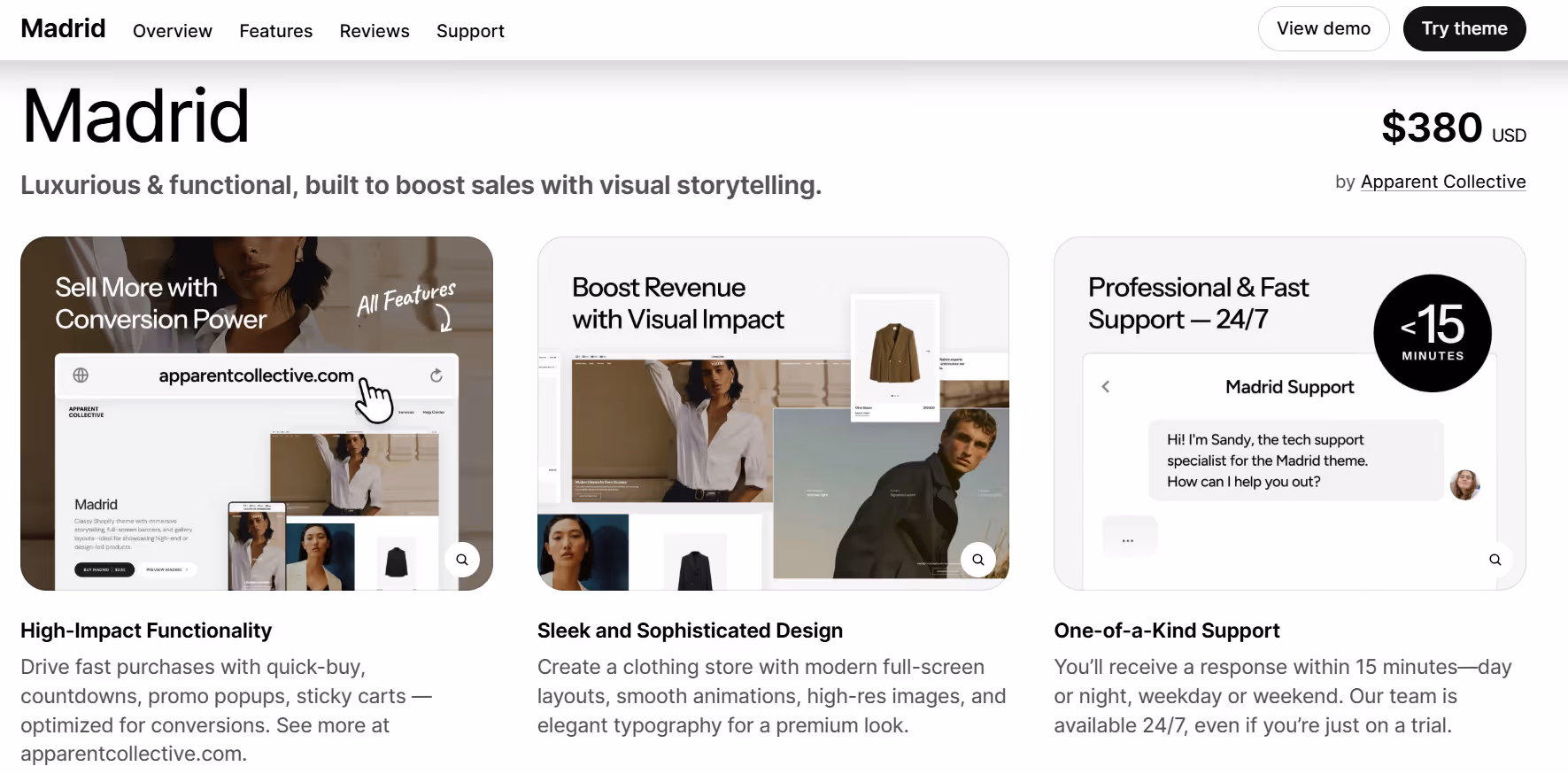Madrid is a Shopify theme preset built to give clothing stores a streamlined, visually-focused layout that emphasizes products without overwhelming visitors. The design typically begins with a bold hero image or slideshow, followed by featured collections and product highlights that flow naturally down the page. Stores using Madrid often mix clean product grids with lifestyle imagery, making it easy for shoppers to see both individual items and how they fit into everyday use. The theme’s overall structure encourages exploration while keeping navigation simple and intuitive.