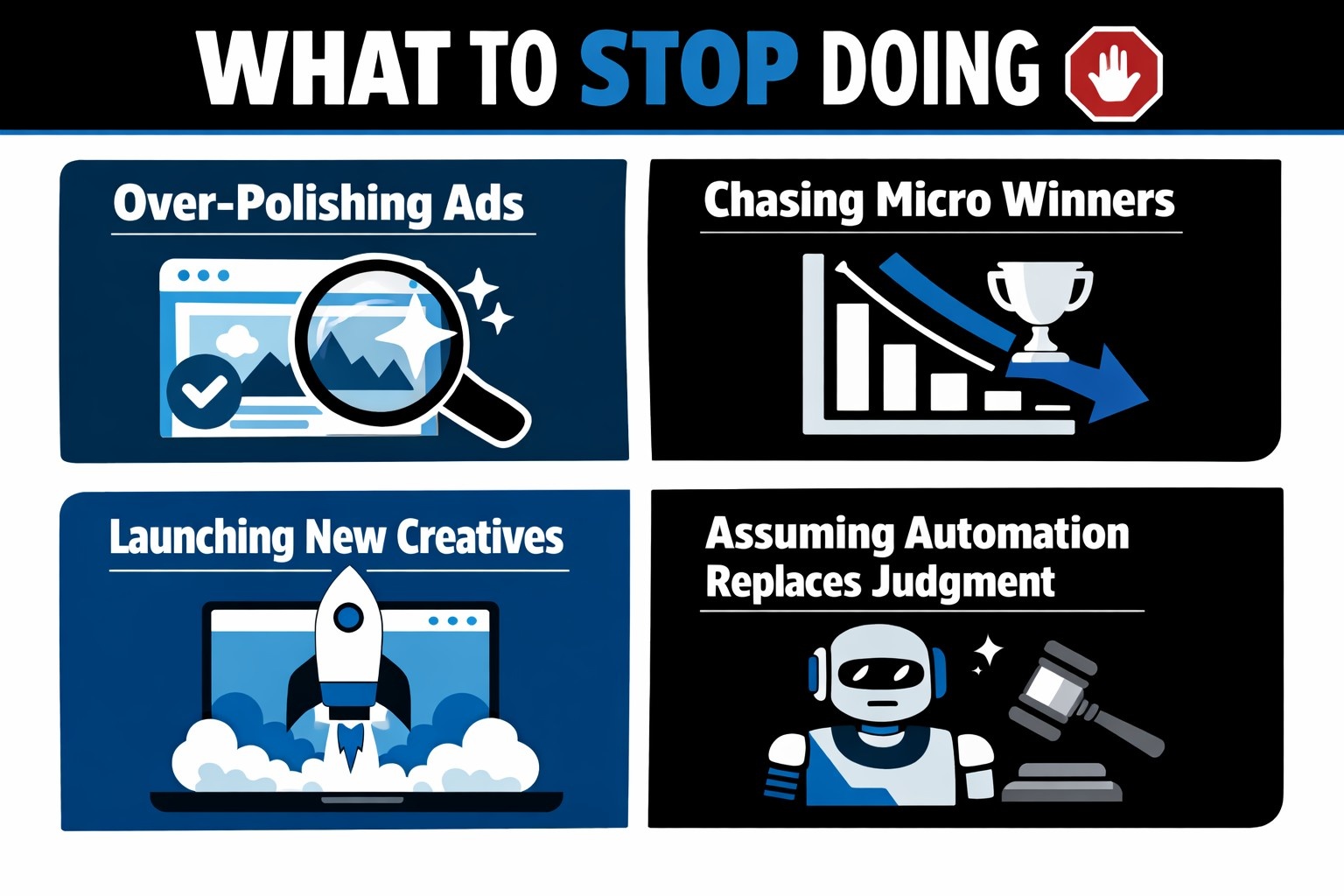 - Stop launching new creatives without retiring old ones. Adding more ads without removing weak or redundant ones dilutes learning and increases internal competition. Creative rotation should be intentional, not additive.