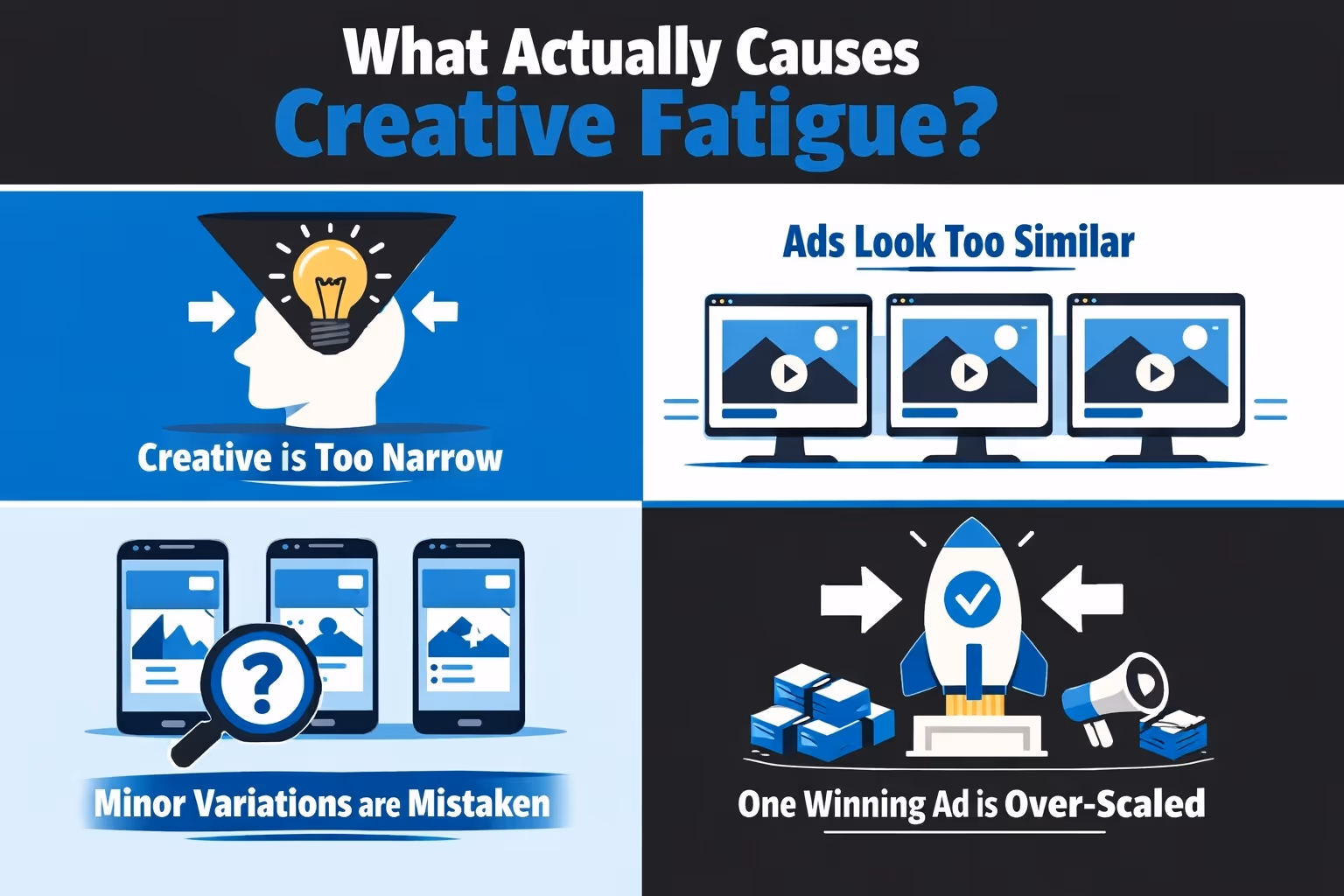When multiple ads share the same layout, composition, and framing, Meta struggles to tell them apart. Even if the copy changes, the system still recognizes the creative as functionally identical. Delivery narrows, and performance plateaus faster than expected.