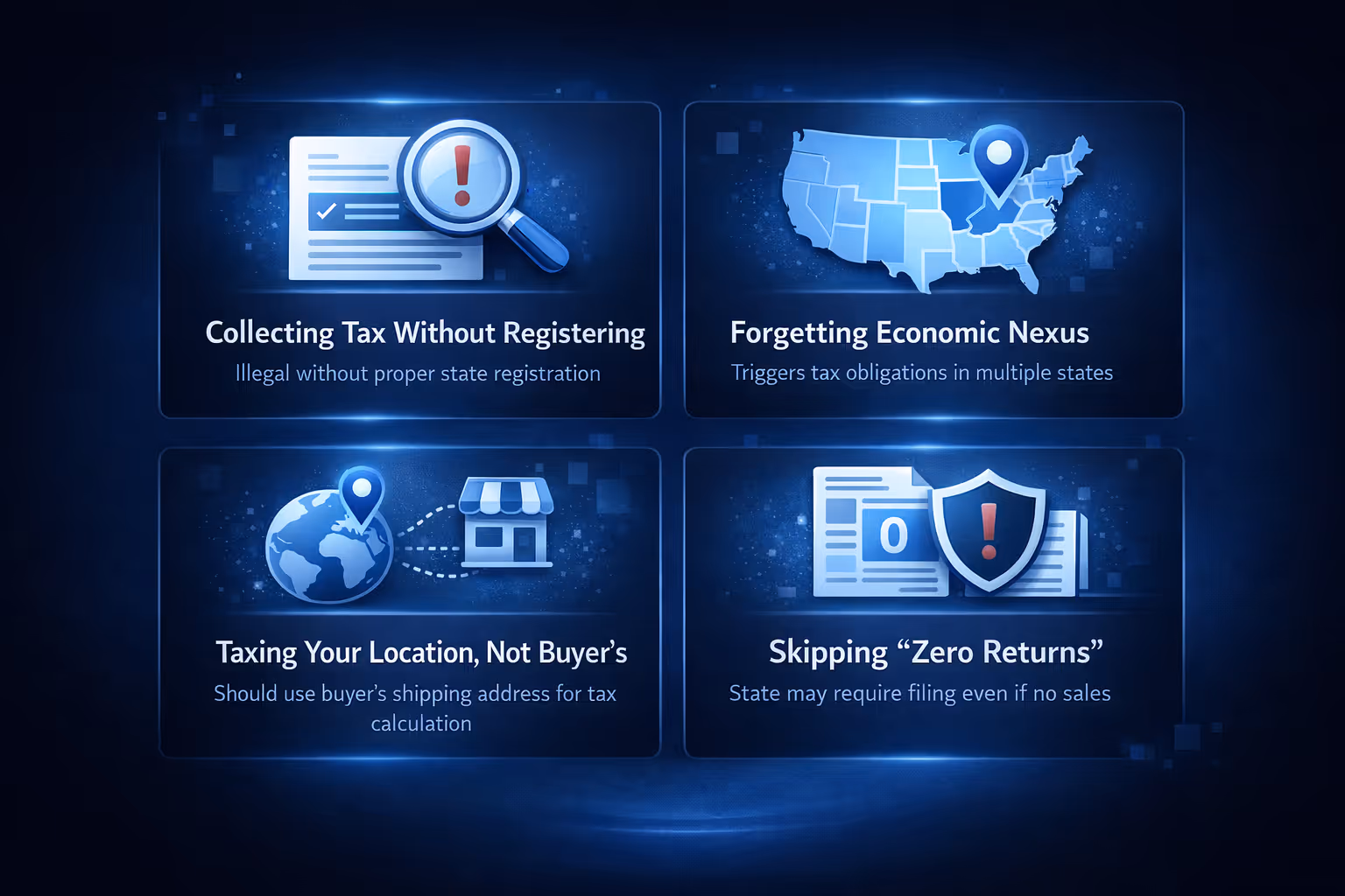 Before you collect anything, you need to be registered in each state where you have nexus. It’s illegal to collect tax without a permit, even if you plan to remit it. Every state has its own process and fee, but many let you register online.