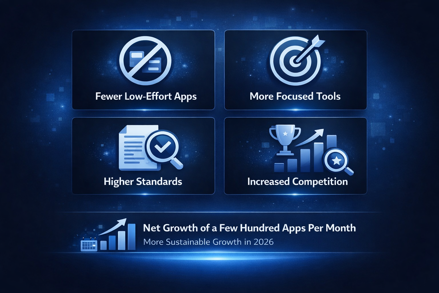 Monthly net growth in 2026 averages a few hundred apps, not thousands. This reflects a more mature ecosystem where quality and differentiation matter more than volume.