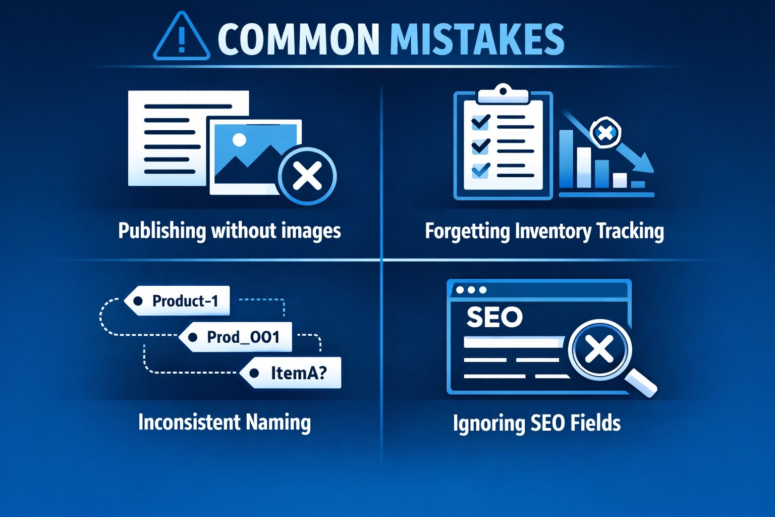None of these mistakes are fatal. They are simply time-consuming to clean up once a catalog grows. Slowing down during product setup and reviewing each section with intention saves far more time than it costs, especially as the store scales.