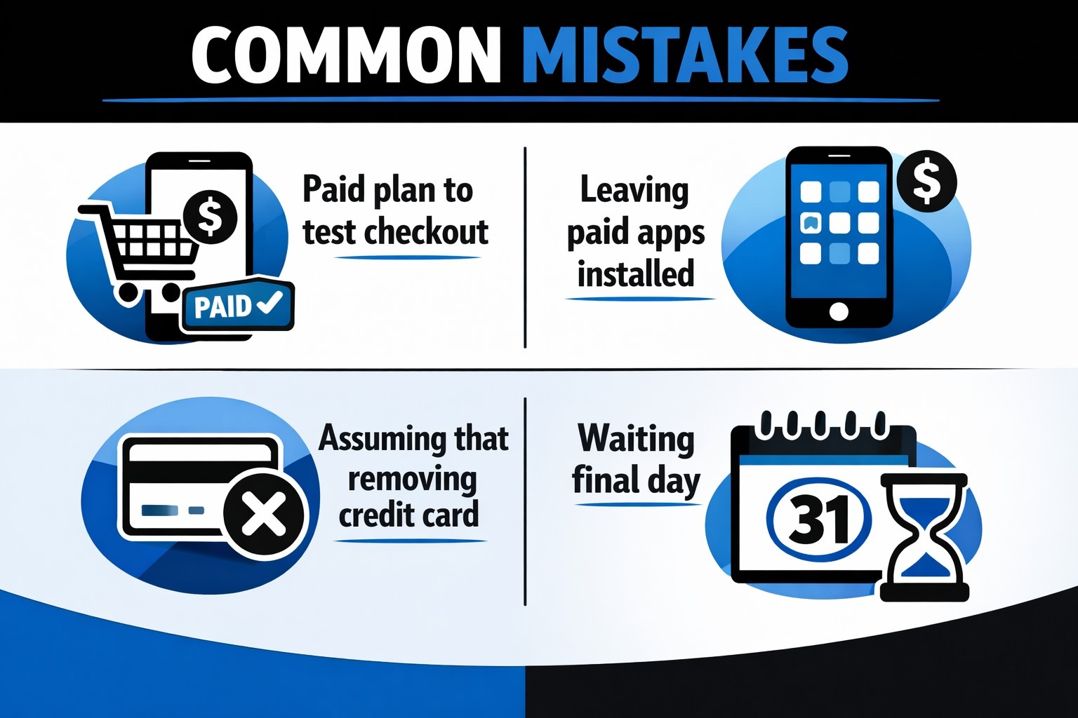 - Waiting until the final day of the trial to cancel and missing time zone cutoffs that trigger billing.