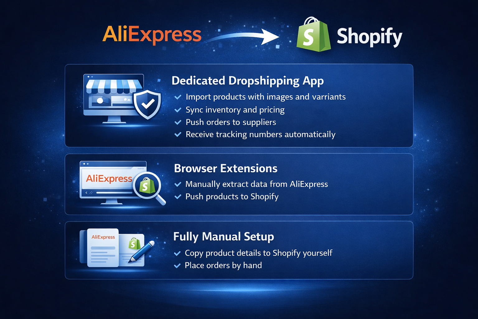 There are three main ways to connect AliExpress to Shopify. Each has trade-offs.