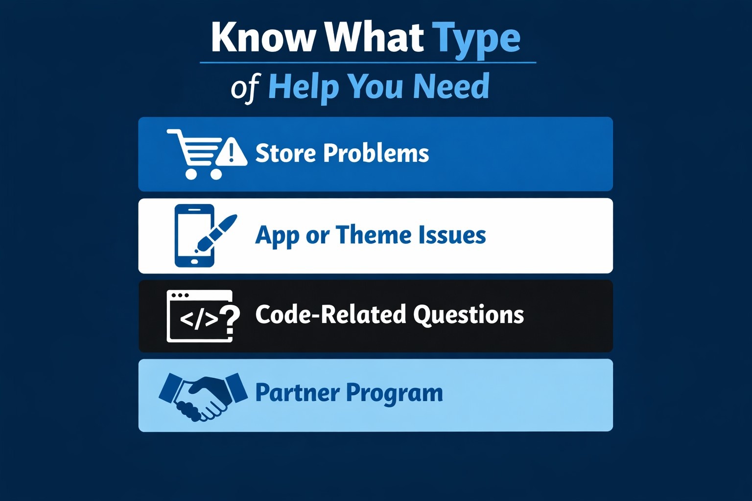 Before you dive into contact forms or search bars, it’s worth figuring out what exactly you need help with. Why? Because Shopify routes support differently depending on the nature of your issue. Here's how it breaks down: