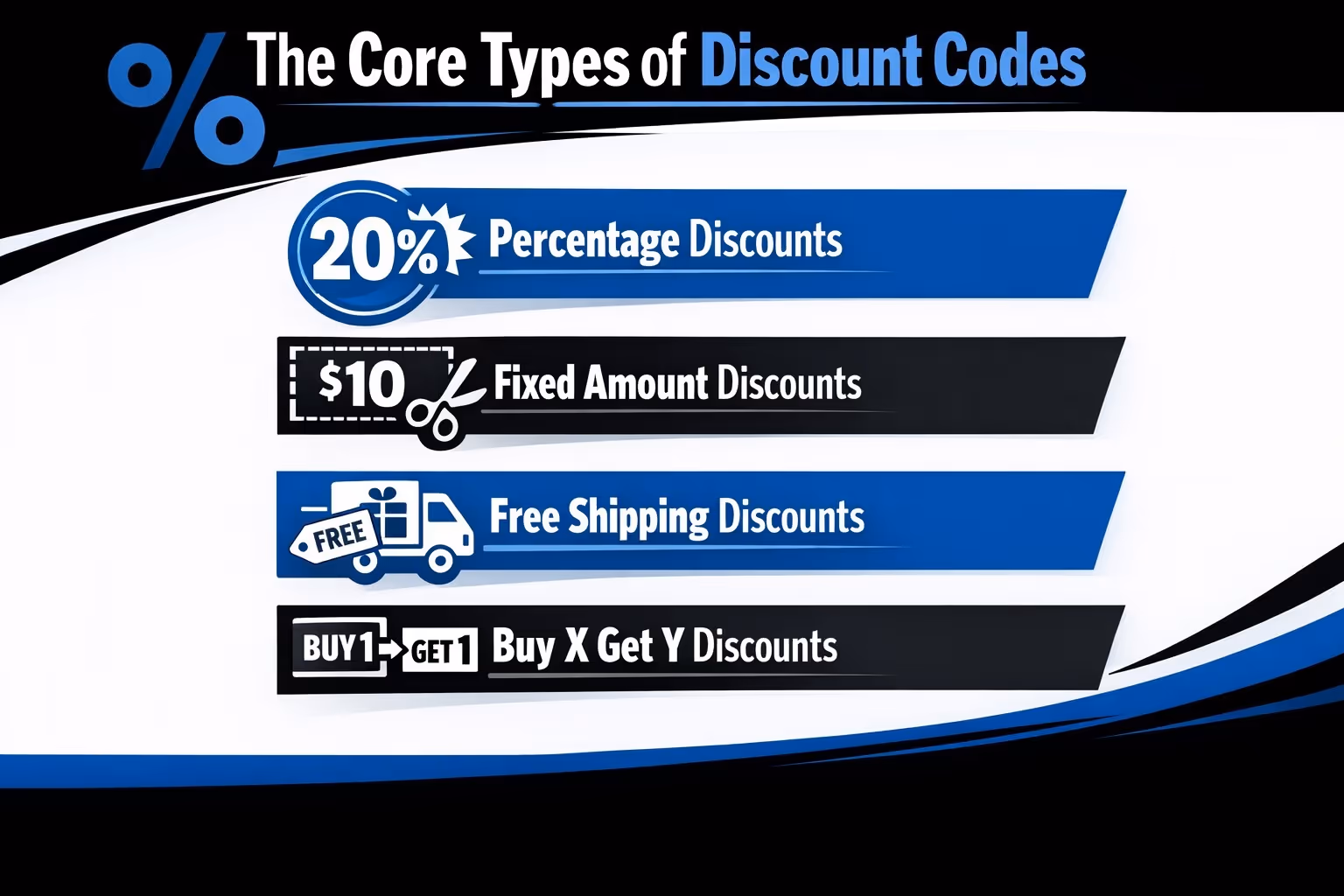Fixed amount discounts subtract a set dollar value, such as $10 off or $25 off.