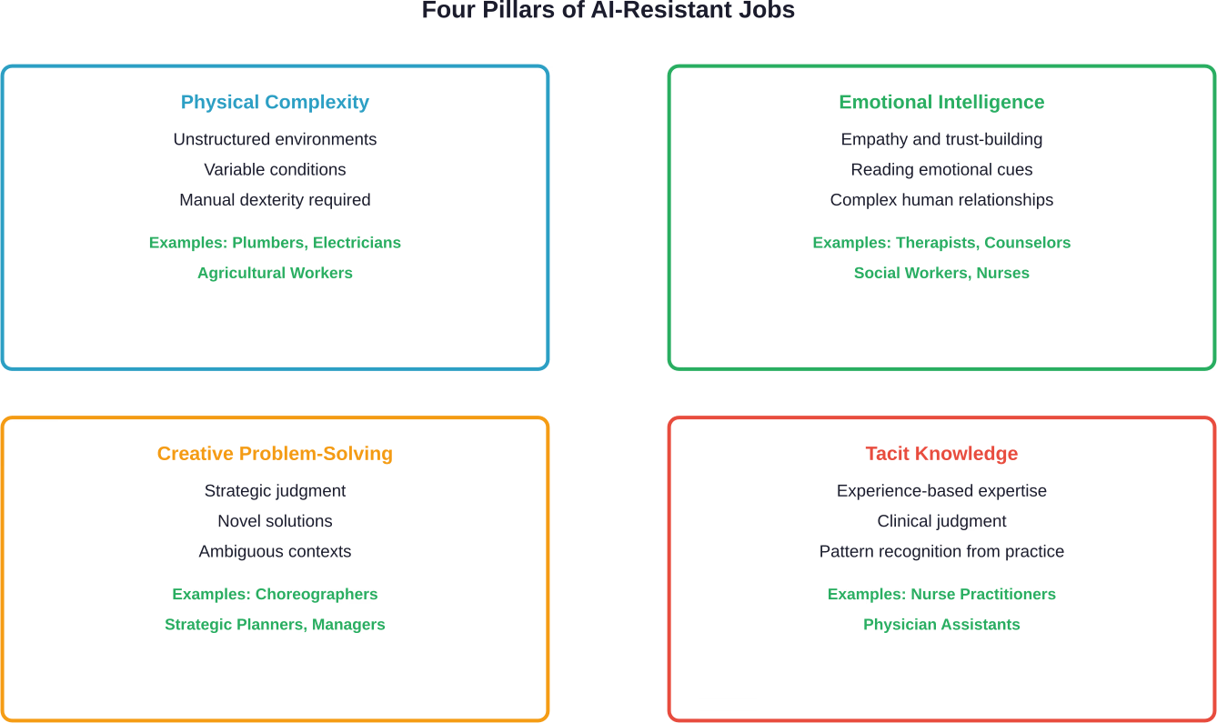 Jobs that resist automation share common characteristics. Understanding these pillars helps predict which careers remain secure: