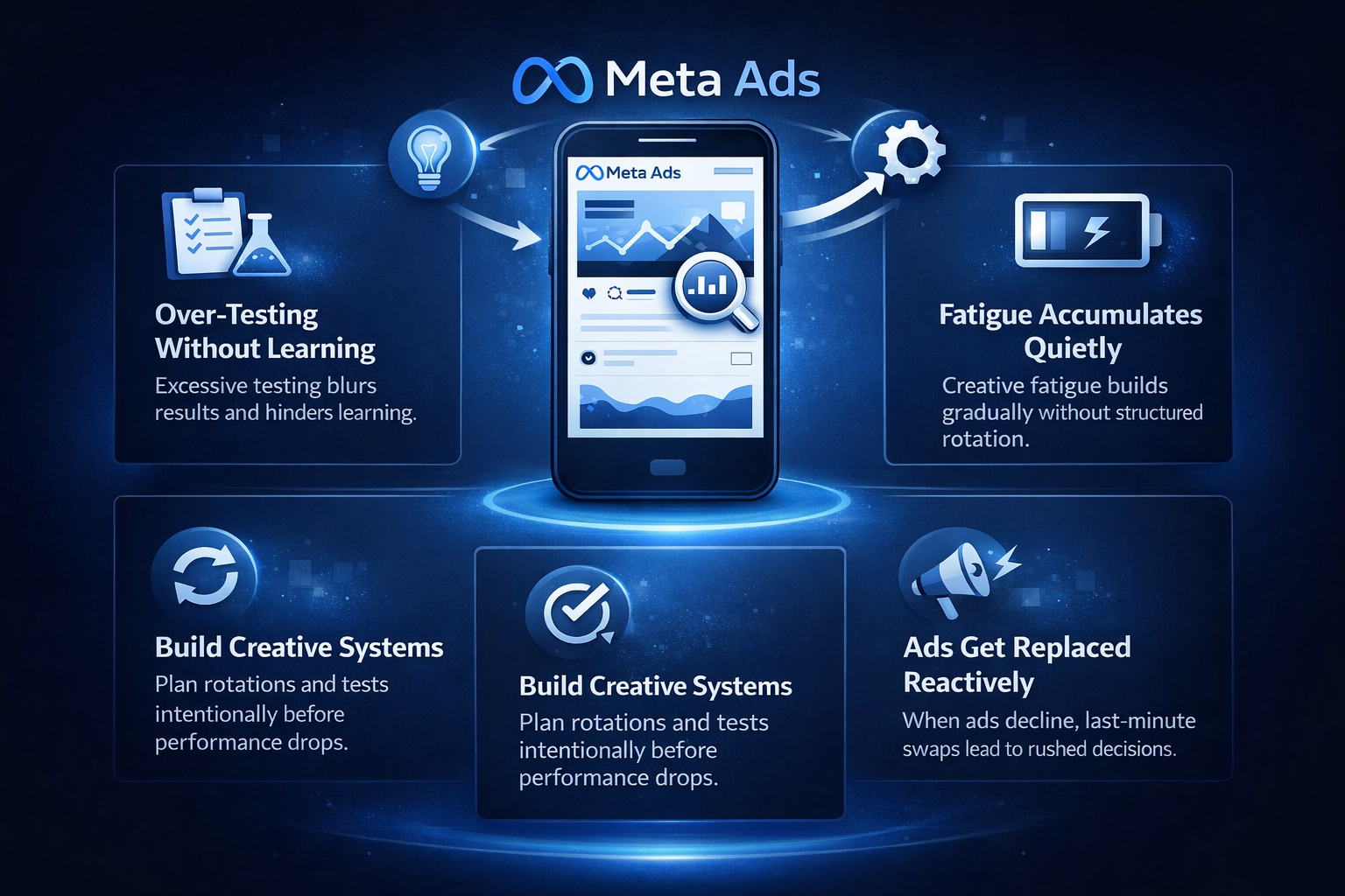 - Creative Systems That Anticipate Fatigue. Creative is managed as a lifecycle. Testing is intentional, rotation is planned, and decay is monitored before performance drops force reactive changes.