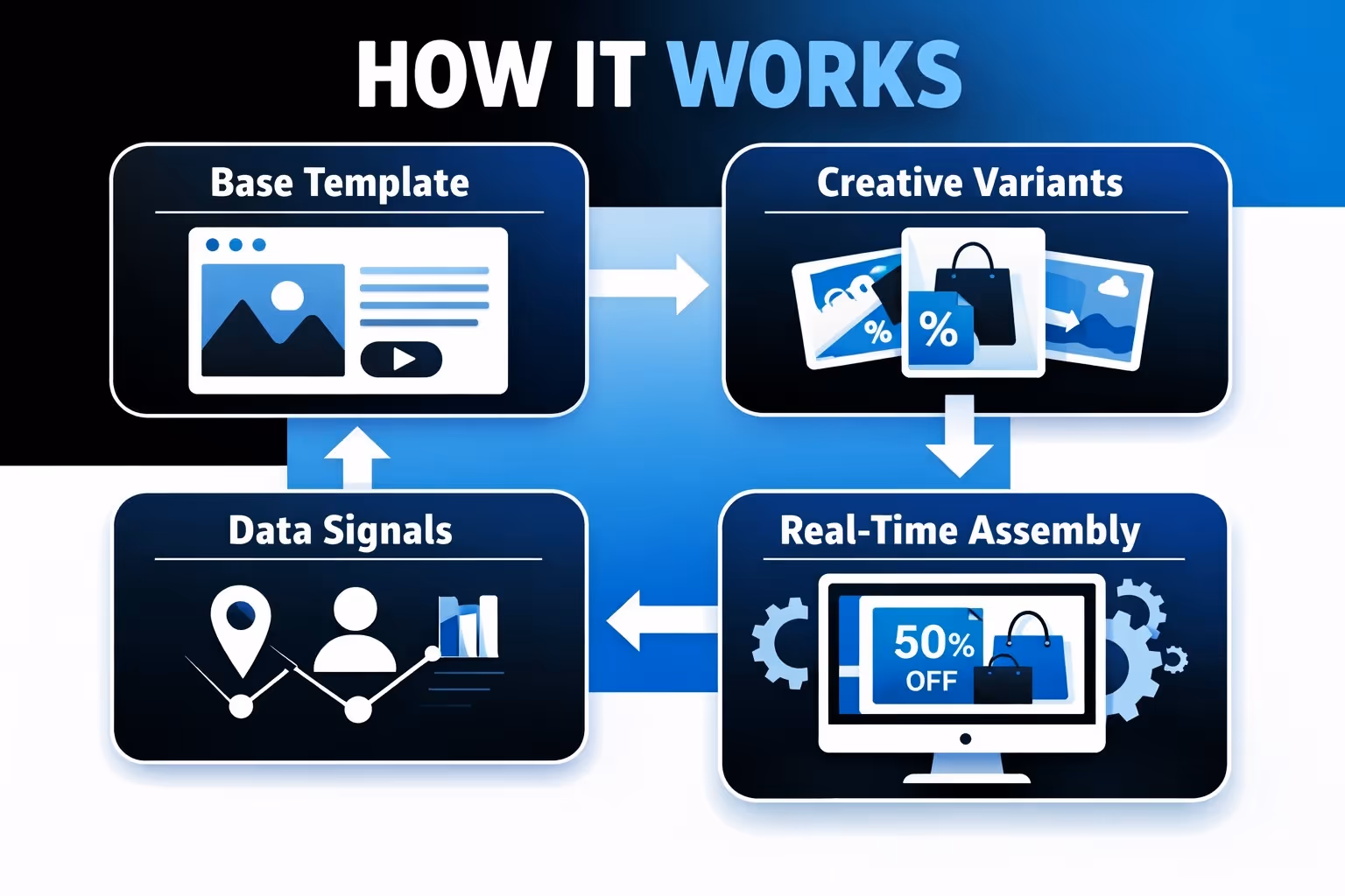 Think of it like a modular ad. The structure stays the same, but the pieces (image, copy, CTA, etc.) change depending on who’s watching.