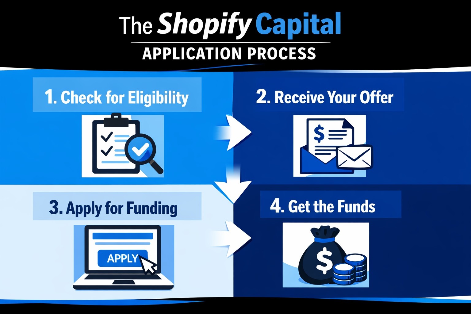 The process for securing funding through Shopify Capital is straightforward, and eligibility is determined by your store’s performance and financial health. Shopify automatically evaluates your store’s activity and customer interactions to determine if you qualify for funding. If you’re eligible, Shopify will notify you via email and your admin panel with an offer to apply for funding.