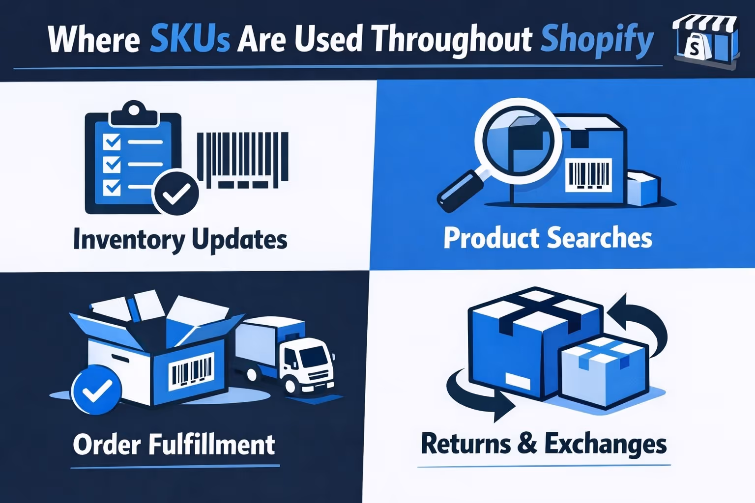 Even if you rarely look at them directly, SKUs are constantly working behind the scenes. Shopify relies on them in several everyday workflows that keep the store running smoothly: